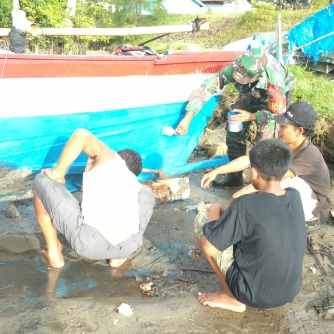 TAPTENG_Memperkuat jalinan keakraban dengan warga binaan, Babinsa Koramil 02/Sorkam, Serda Hendrawan Purba membantu Nelayan memperbaiki perahu yang rusak. Bertempat di Desa Pasar Sorkam, Kecamatan Sorkam Barat, Kabupaten Tapanuli Tengah (Tapteng).