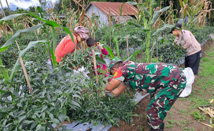 Dalam kegiatan tersebut, Babinsa Koramil 07 Juhar Serka R. Hutagalung, membantu petani yang sedang melakukan perawatan pada tanaman cabai rawit.