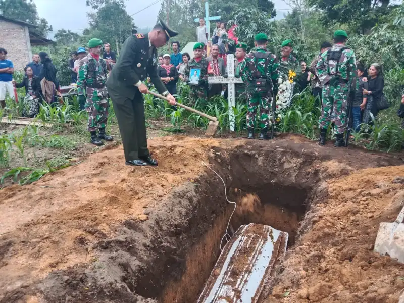 TAPUT – Danramil 22/Tarutung Kapten Inf Jonny Lumbantoruan beserta anggota melaksanakan Upacara Pemakaman militer anggota Kodim 0107/Aceh Selatan An. Kopda Jumri Efendi Simanungkalit karena sakit bertempat di dusun Garaga Kel. Situmeang Habinsaran Kec. Sipoholon Kab. Taput, Senin (25/9/2023).