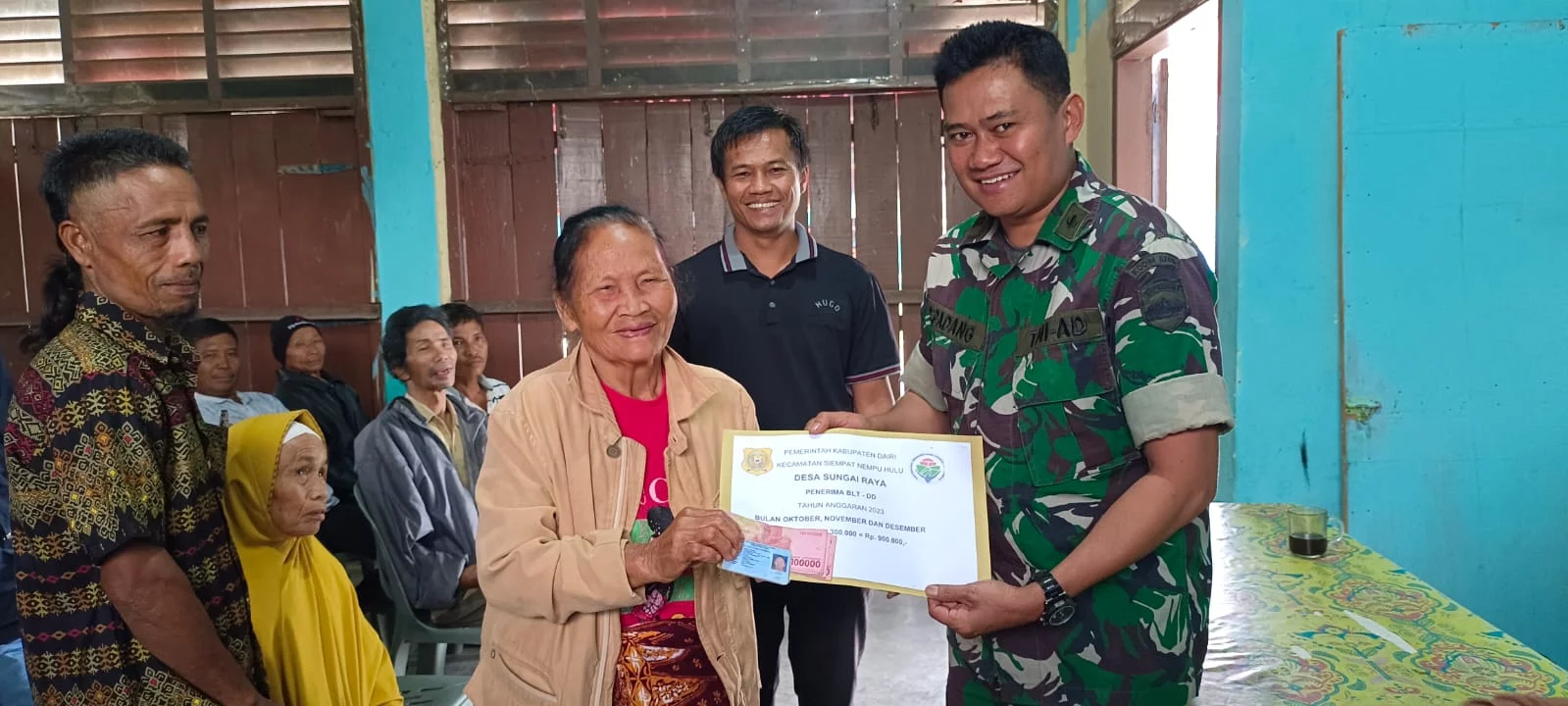 Peltu Suwanto Padang Danpos Kecamatan Siempat Nempu Hulu Koramil 04/Tigalingga Kodim 0206/Dairi menghadiri kegiatan penyaluran Bantuan langsung Tunai Dana Desa (BLT-DD) tahap IV untuk bulan Oktober, November dan Desember 2023 yang bertempat di kantor Desa Sungai Raya Kecamatan Siempat Nempu Hulu kabupaten Dairi, Pada Jum’at (24/1-2023)