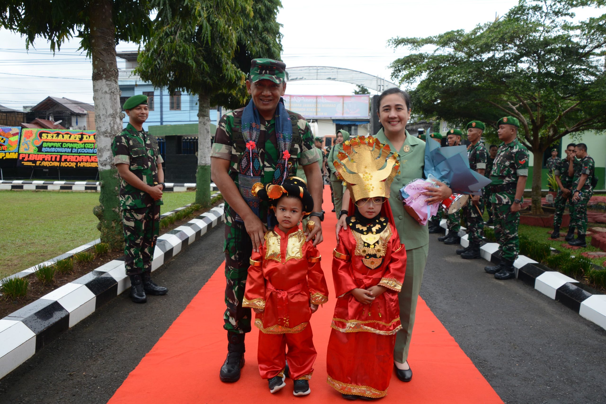 Tiba di Makodim Danrem dan rombongan disambut Dandim 0212/TS Letkol Arm Delli Yudha Nurcahyo, Pengalungan bunga, pemberian Bucket, tarian penyambutan, mengulosi oleh tokoh masyarakat setabagsel.